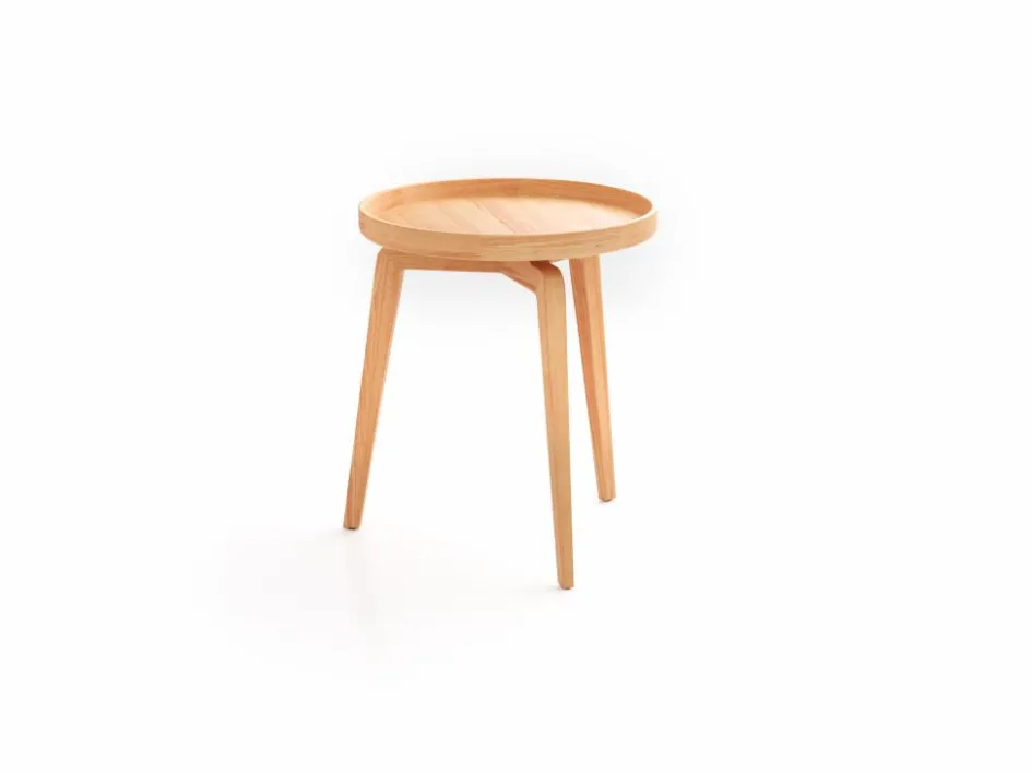 Die optisch etwas vom Fußgestell abgehobene Tischplatte ist mit einem spielerisch hochgezogenen, umlaufenden Rand versehen – ein Rondell für die kleinen Dinge des Alltags, die nicht verloren gehen sollen.