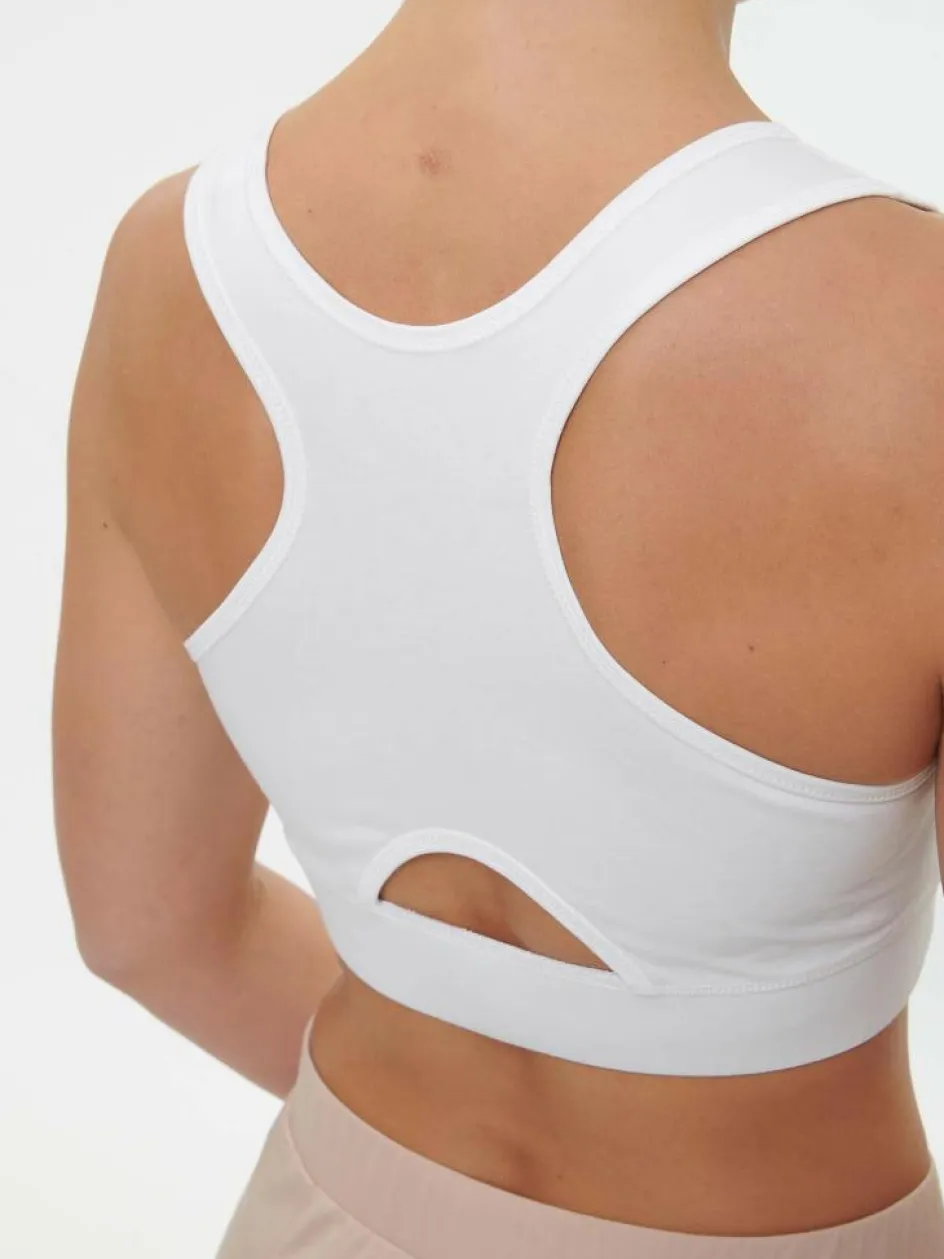 Sportliches Yoga-Bra-Top aus feiner Baumwolle und ohne Elasthan – anschmiegsam, weich, flexibel. Das Bustier ist doppelt gearbeitet, mit sportivem Boxer-Rücken, tiefem Armausschnitt und breitem Gummibund am Saum. Dank der durchdachten Schnittführung entsteht natürlicher Tragekomfort und optimale Bewegungsfreiheit.