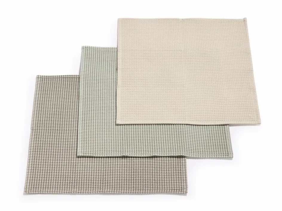 strengen Global Organic Textile Standard gefertigt sowie zertifiziert. Charakteristisch für Piqué-Qualität ist die besondere Struktur, die sich aus höheren und tieferen Stellen zusammensetzt. Durch das vergrößerte Volumen der Wabenstruktur sind die 35 x 35 cm großen Haushaltstücher sehr saugstark. Nach dem erstmaligen Waschen zieht sich die Ware zusammen und der Waffeleffekt wird verstärkt.