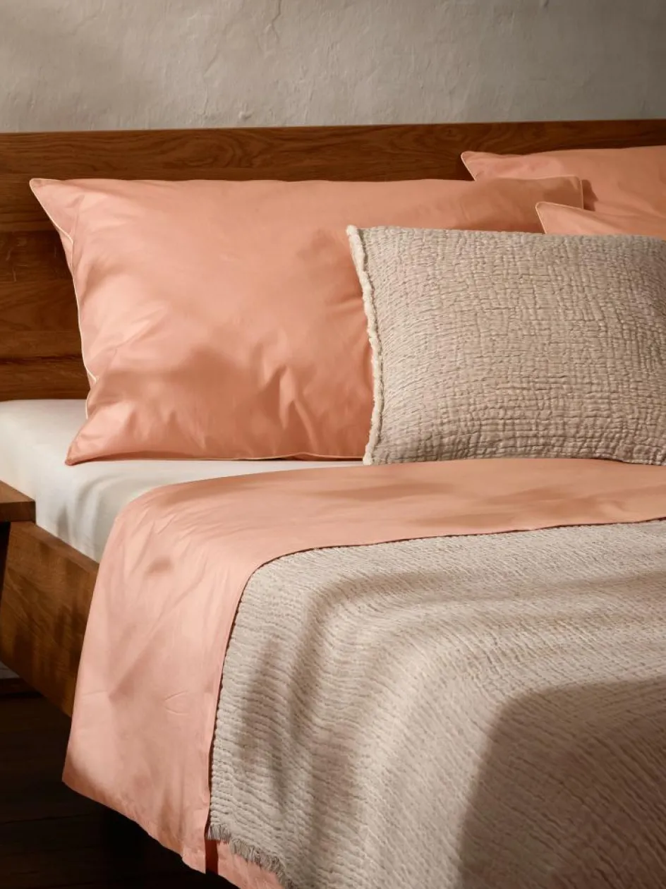 Die Bettwäsche Edna begeistert mit ihrer besonderen Leichtigkeit und edler Haptik aus hochwertigem Perkal. Die feine, dicht gewebte Baumwoll-Qualität zeichnet sich durch ihre glatte Oberfläche und ihre besonders atmungsaktive Struktur aus – ideal für erholsame Nächte und ein angenehmes Schlafklima. Der Deckenbezug überzeugt mit schlichter Eleganz ohne Paspelierung, während die Kissenbezüge mit zarten Paspeln in Kontrast die klassische Formensprache stilvoll abrunden. Das durchdachte Konzept ermöglicht es, Decken- und Kissenbezüge nach Belieben zu kombinieren und dabei stets ein harmonisches und stilvoll elegantes Gesamtbild zu schaffen.