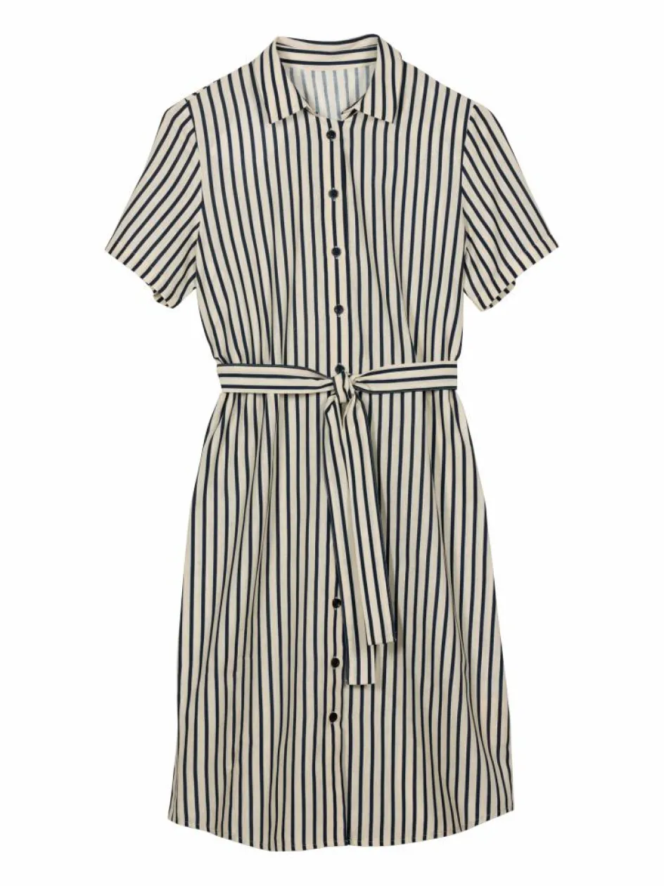 Hemdblusenkleid in sommerlicher Qualität: hautfreundliche Baumwolle kbA trifft auf hochwertiges Leinen – atmungsaktiv, weich und natürlich strukturiert.Gerader Schnitt in regulärer Passform,durch ein Bindeband lässt sich die Weite im Taillenbereich regulieren. Mit Halbarm, durchgehender Knopfleiste, klassischem Kragen und dezenter Streifendessinierung überzeugt das Kleid durch seine reduzierte, moderne Ausstrahlung. Ideal für warme Tage – unkompliziert, stilvoll, natürlich.