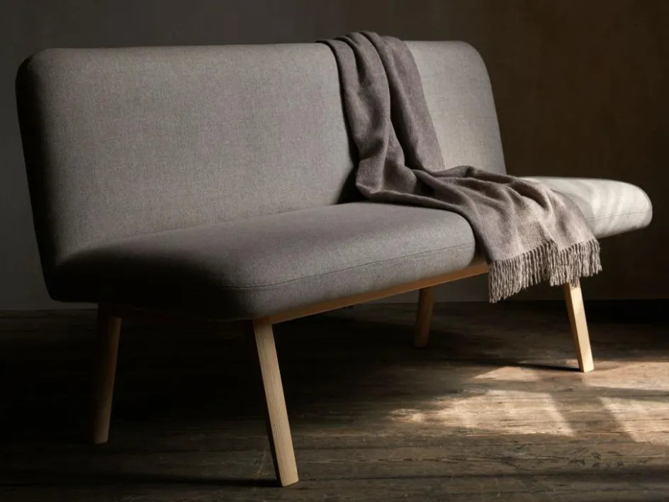 Getragen wird der Polsterteil von einem Fußgestell mit gerundeten Ecken und Kanten. Beide Teile sind von wieder lösbaren Holzsteckverbindungen fest zusammengehalten. Die nach innen versetzte Position der Bankbeine erleichtern die Bewegungsfreiheit der am Tisch Sitzenden. Schönes Designdetail: Die nach oben verlängerten Hinterbeine der Bank überlappen die Rückenlehne und stützen diese gleichsam. So macht Ketil auch freistehend gute Figur.