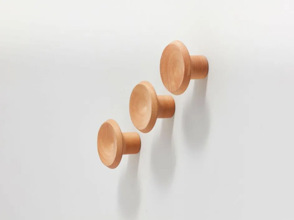 Auf den Punkt gebrachte, witzig-orginelle, einfache Lösung für Hüte, Taschen, Mäntel, Jacken, Schirme und – aufgrund des „Halses“ der Knöpfe – auch Kleiderbügel. Elegante, moderne Form mit nach innen gewölbtem „Hut“; Massivholz aus Europa, attraktive Holzmaserung, in einem Tiroler Betrieb sorgfältig für uns gedrechselt, naturgeölt.